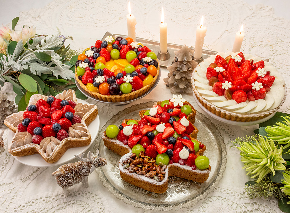 今年的蛋糕採用了聖誕樹、花環、星星等聖誕主題,共準備了四種。新作包括醇厚的布列塔尼產“Le Gaul”奶油芝士搭配新鮮草莓,以及可可香巧克力與酸甜草莓的絕妙組合。除此之外,每年廣受好評的,以色彩繽紛的水果為主角的聖誕樹和花環形塔也將登場。
