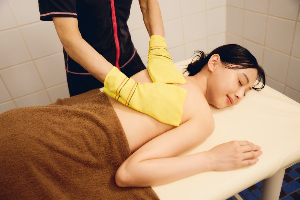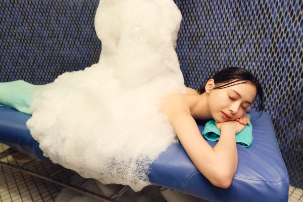 全身覆蓋大量泡沫,使用天然材料製成的手套來護理身體。