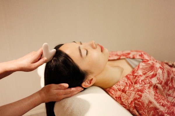 不弄濕頭髮,用刮痧和手來放鬆頭部和頸肩的緊繃。