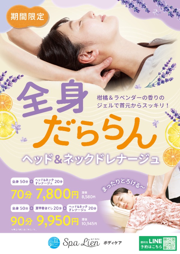 ●全身放鬆頭部&頸部引流 90分鐘 9,950 日元 (深夜 10,945 日元)