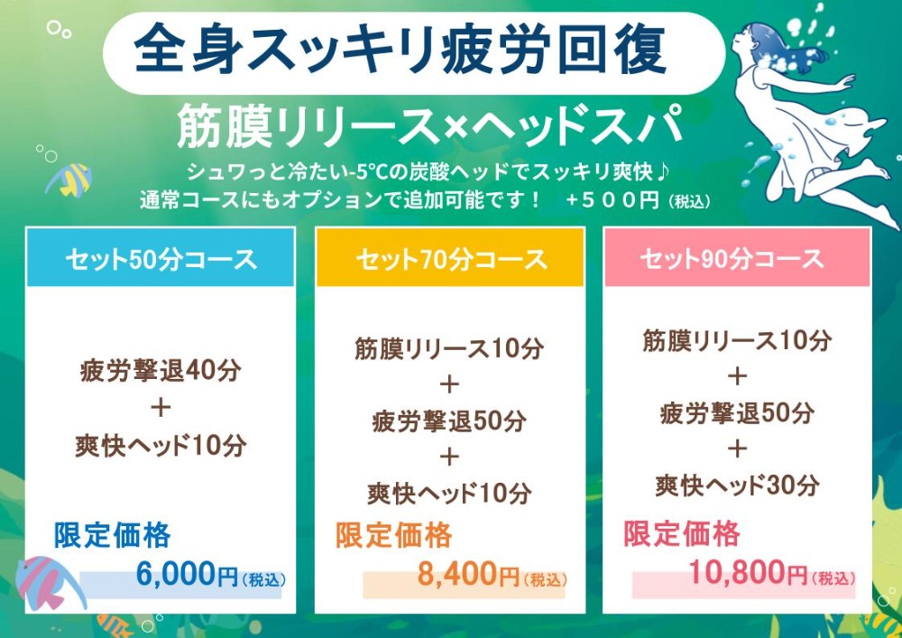 因為是擊退疲勞的套餐,可以以肩胛骨為中心放松全身,所以不管是第一次放松的人,還是沒有放松的人,都是推薦的套餐。